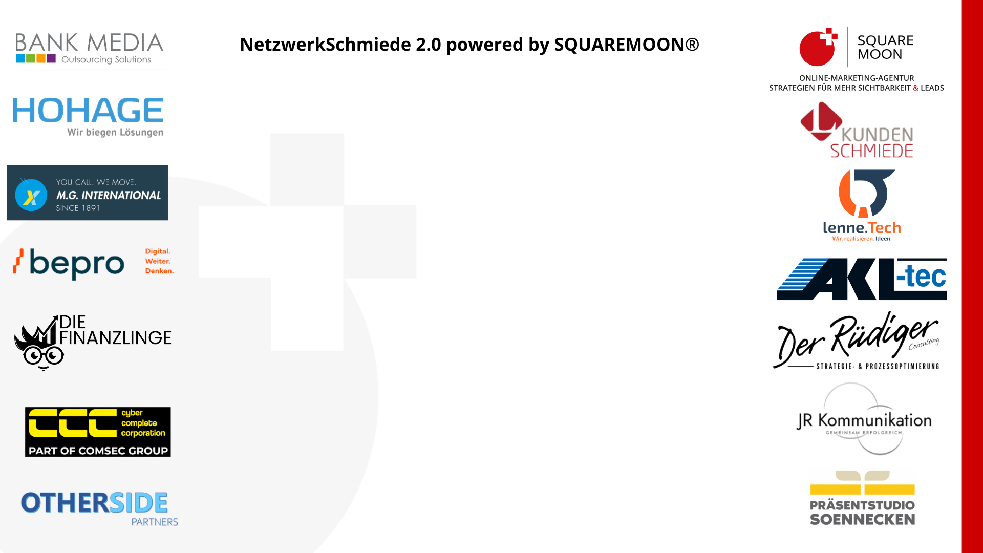 Willkommen in der neuen NetzwerkSchmiede – dem Business-Netzwerk, verwaltet von der SQUAREMOON GmbH, für Unternehmer, Führungskräfte und Entscheider aus dem Sauerland, dem Hochsauerlandkreis und dem Ruhrgebiet.